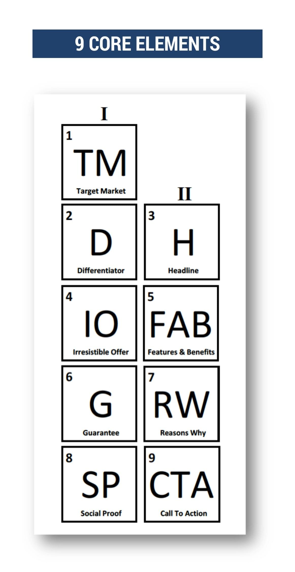 • CORE ELEMENTS: After decades of testing and literally tens of thousands of tests we've discovered that there are 9 key tactics that make marketing work.